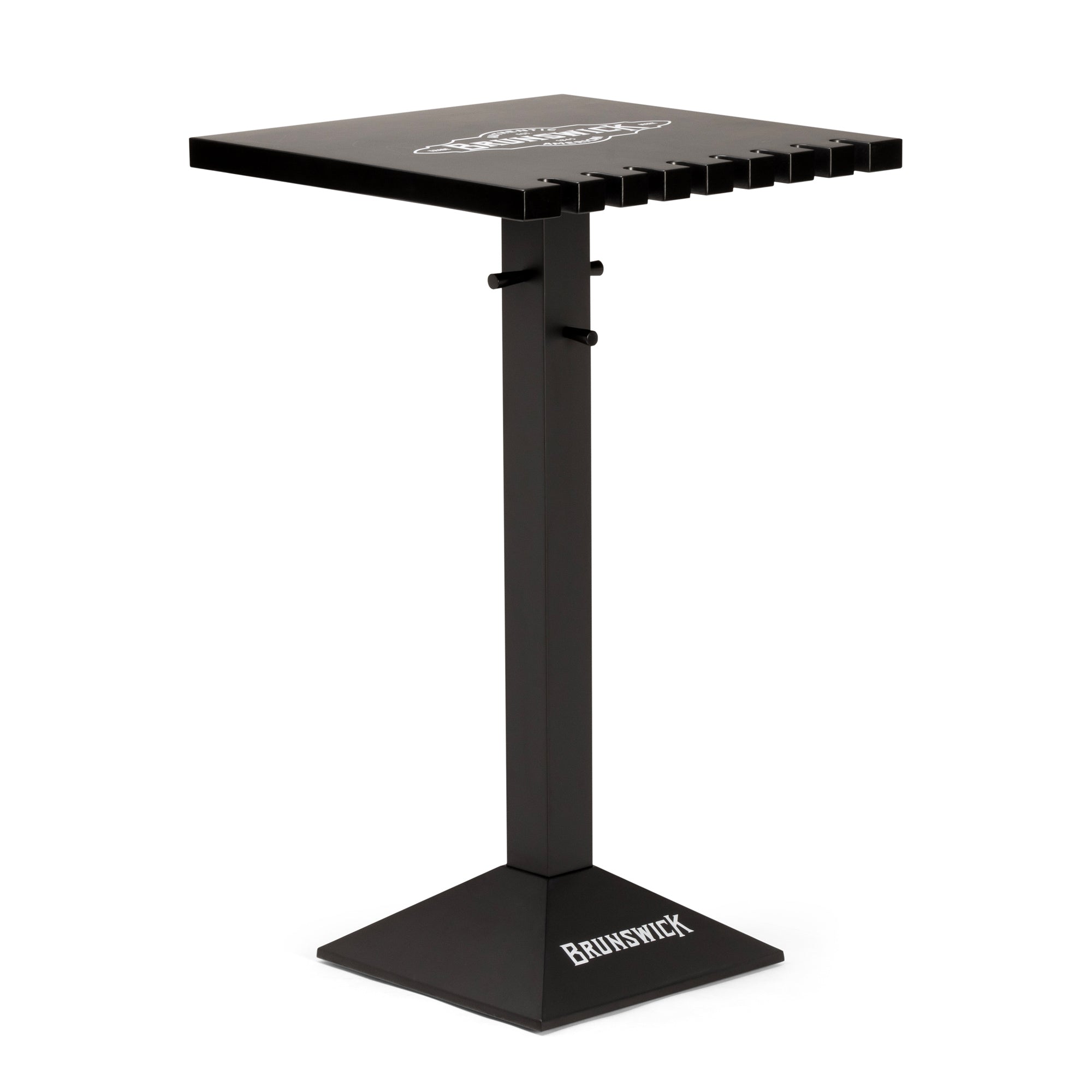 Commercial grade metal base with a durable wood top. Matte black finish with Brunswick shield logo. Holds up to 8 cues and includes racks and multiple hooks for accessories.
